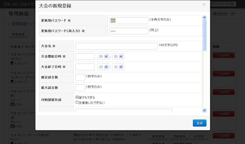 「更新用パスワード」を入力して「作成」ボタンを押すと、大会の対戦部屋を作成することができます。