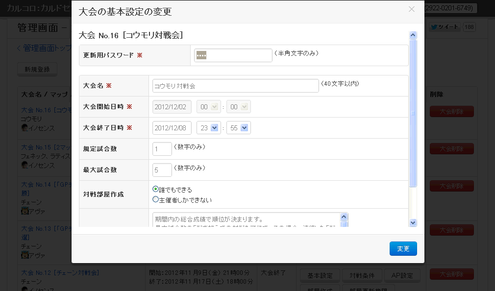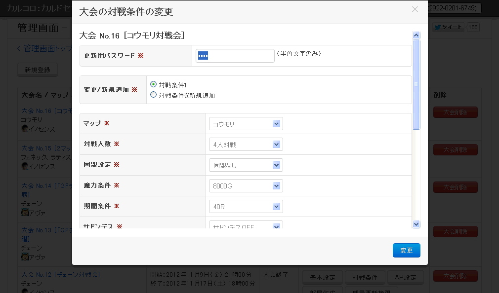 「更新用パスワード」を入力して「変更」ボタンを押すと、大会の対戦条件を変更することができます。