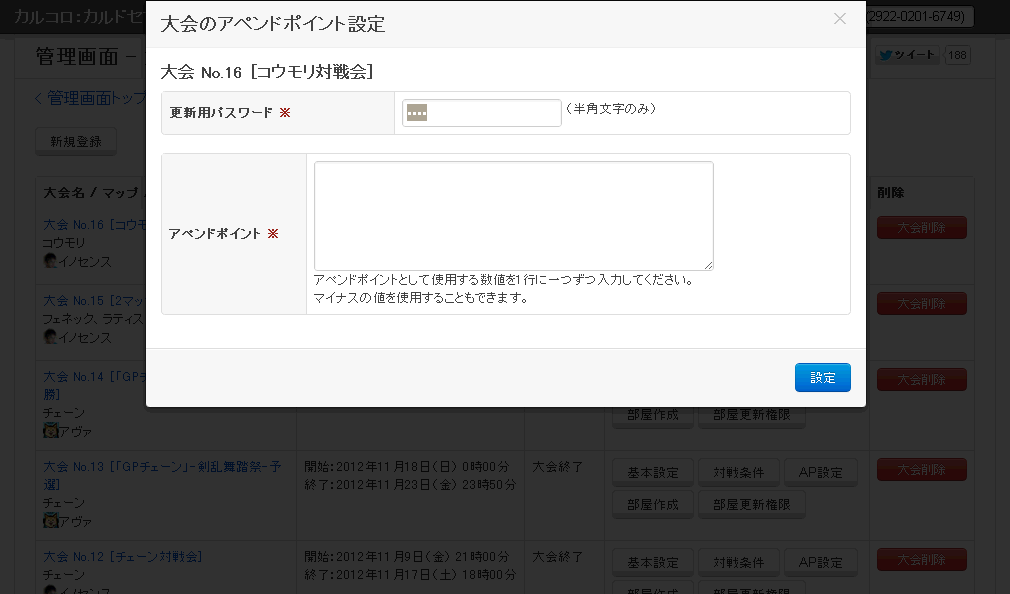 「更新用パスワード」を入力して「設定」ボタンを押すと、大会のアペンドポイントを設定することができます。