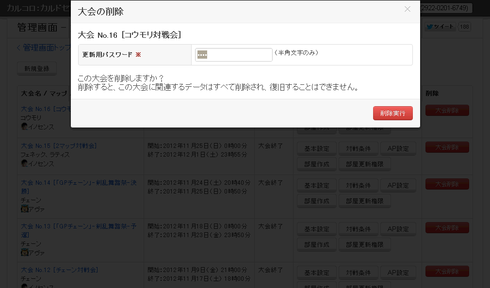 「更新用パスワード」を入力して「設定」ボタンを押すと、その大会で作成されている全ての対戦部屋に対する更新権限を取得できます。